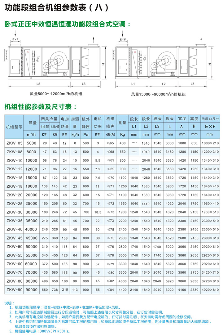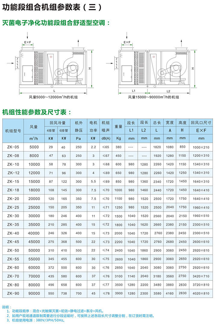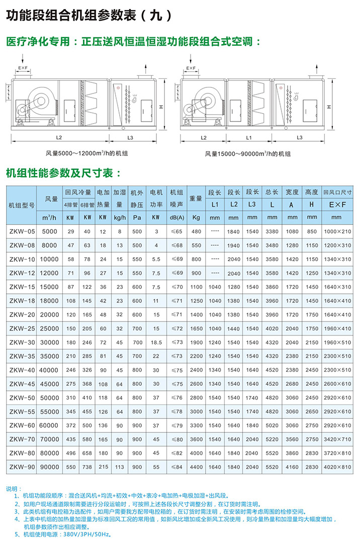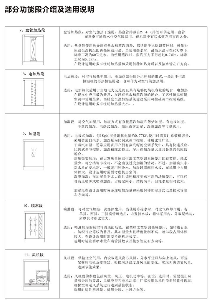 5、组合式空气处理机组有近十多种功能,用户可根据工程需要,任意选择组合。订货时请向本公司提供组合示意图一张,并注明主要技术参数及安装尺寸要求等。