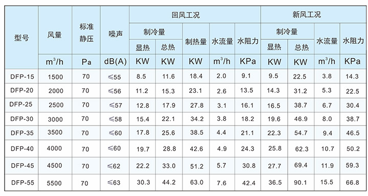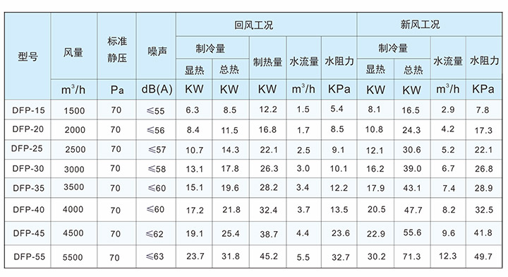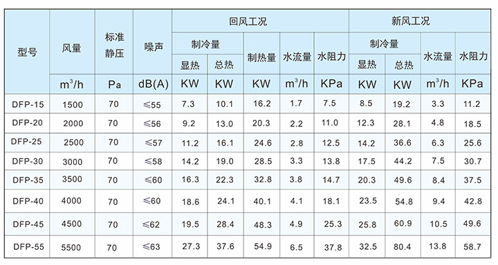 2、制冷工况:进风干球温度27℃,湿球温度19.5℃,冰水进水温度7℃,出水温度12℃。