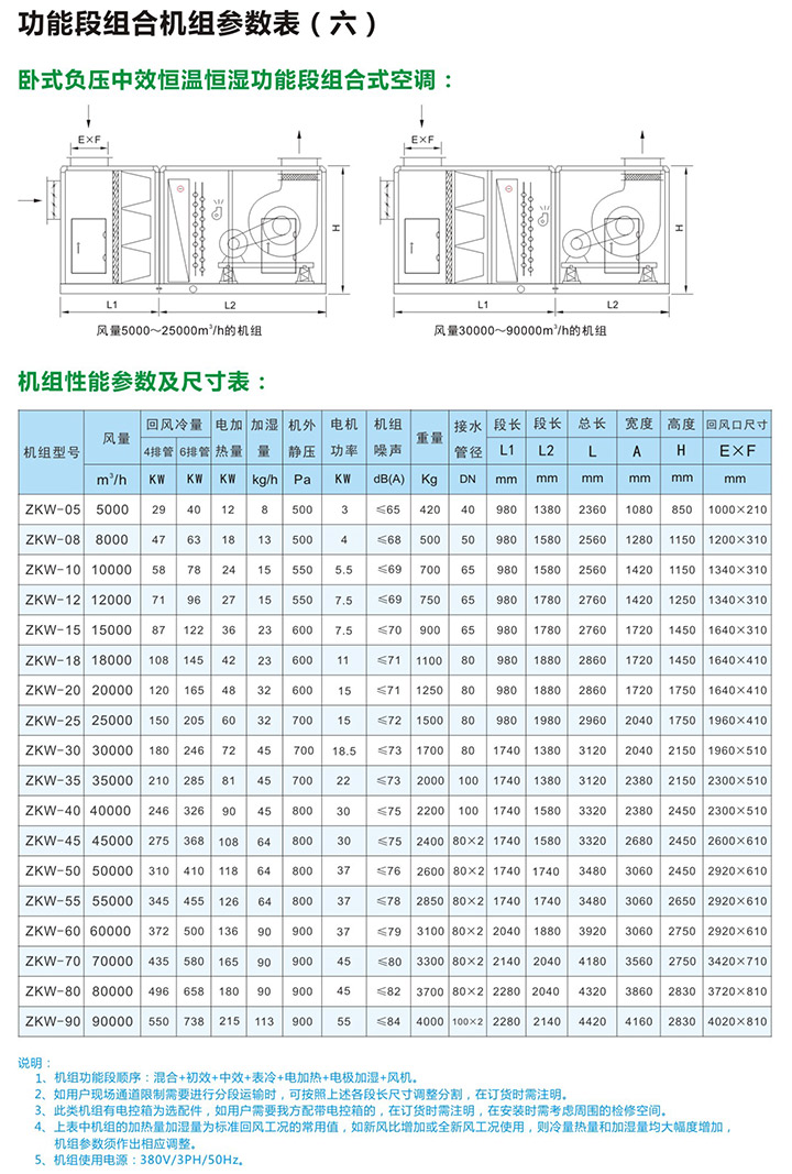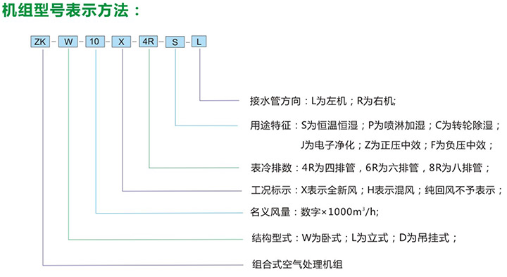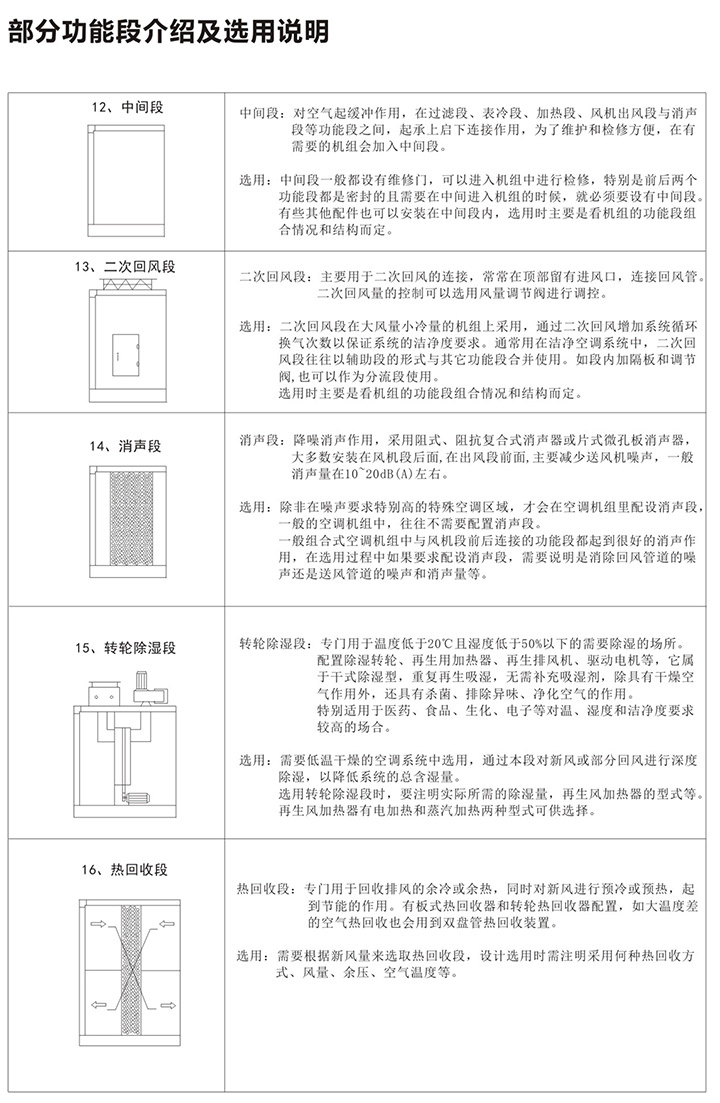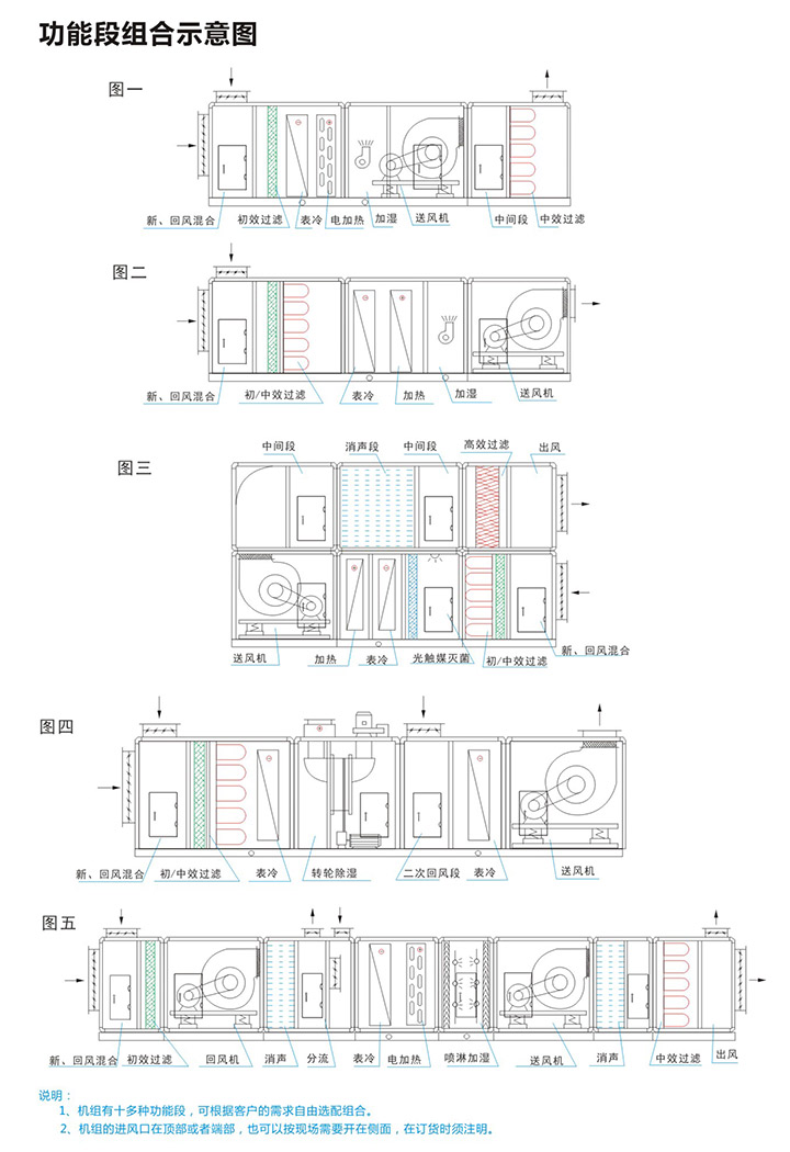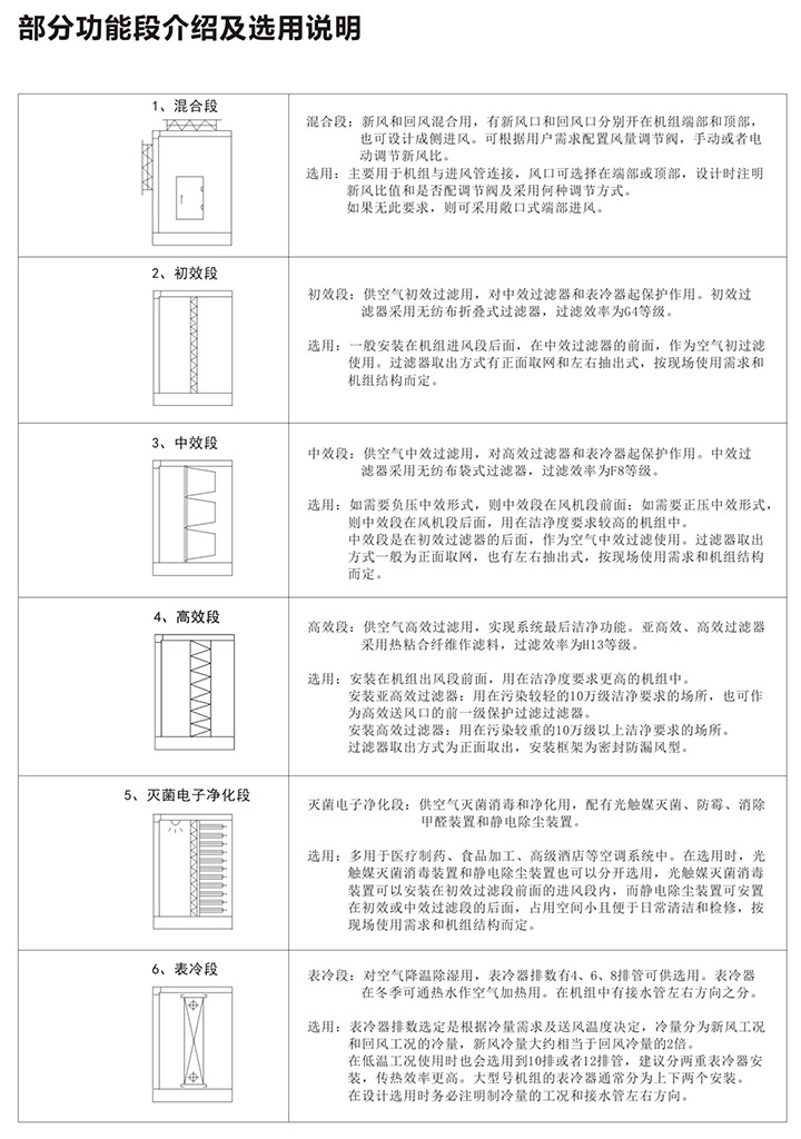 5、组合式空气处理机组有近十多种功能,用户可根据工程需要,任意选择组合。订货时请向本公司提供组合示意图一张,并注明主要技术参数及安装尺寸要求等。